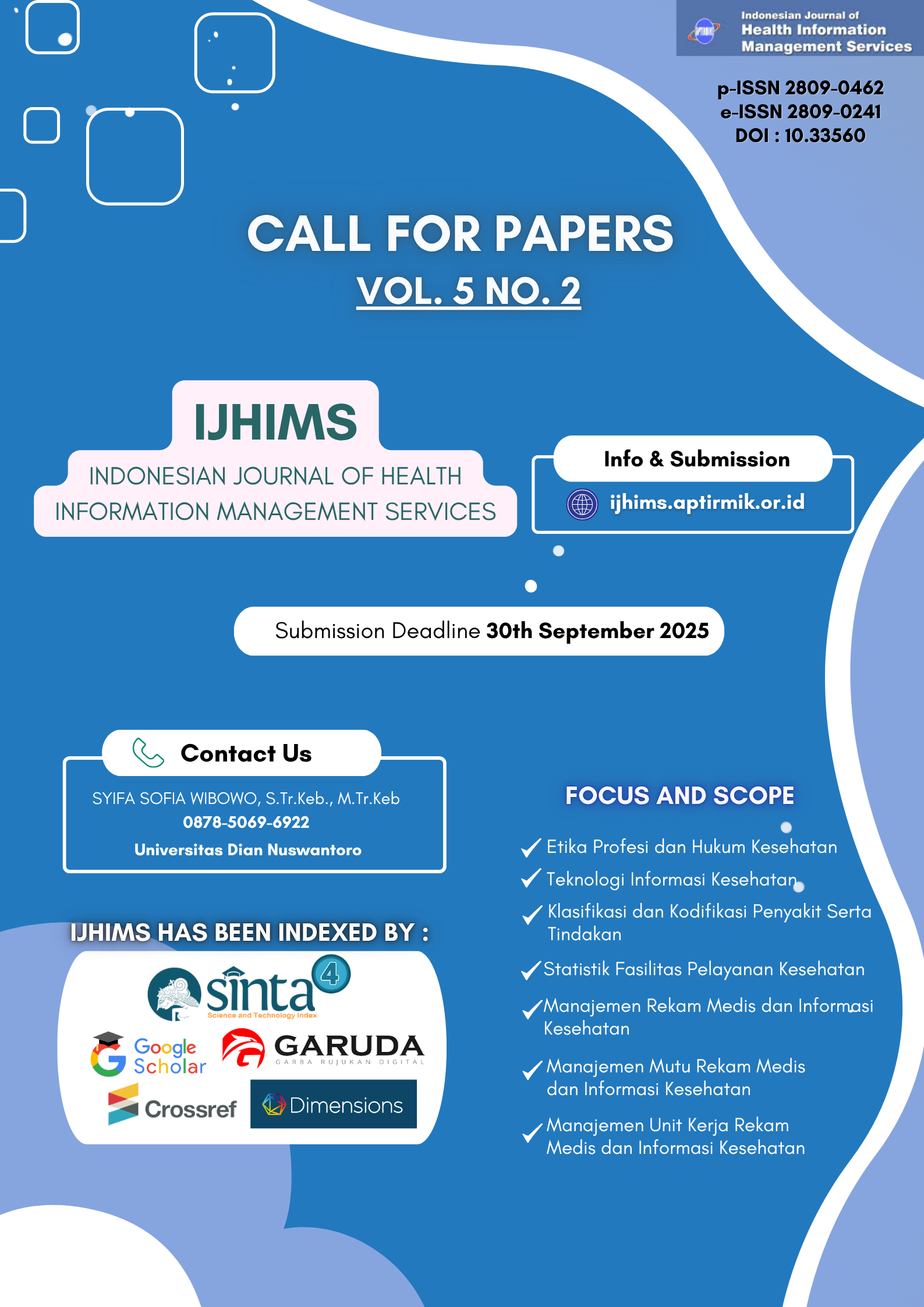 IJHIMS mengundang Bapak/Ibu dosen, peneliti, Mahasiswa dan Praktisi untuk mengirim Artikel hasil kegiatan pengabdian kepada masyarakat di Indonesian Journal of Health Information Management Service untuk terbitan Vol. 5 No. 2 Bulan Oktober 2025.